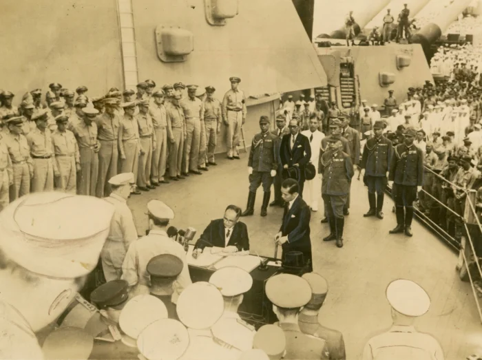 私は、日本国政府に、アメリカ・イギリス・中国・ソ連の4国に対して、それらによる共同宣言(ポツダム宣言)を受諾することを通告させた。