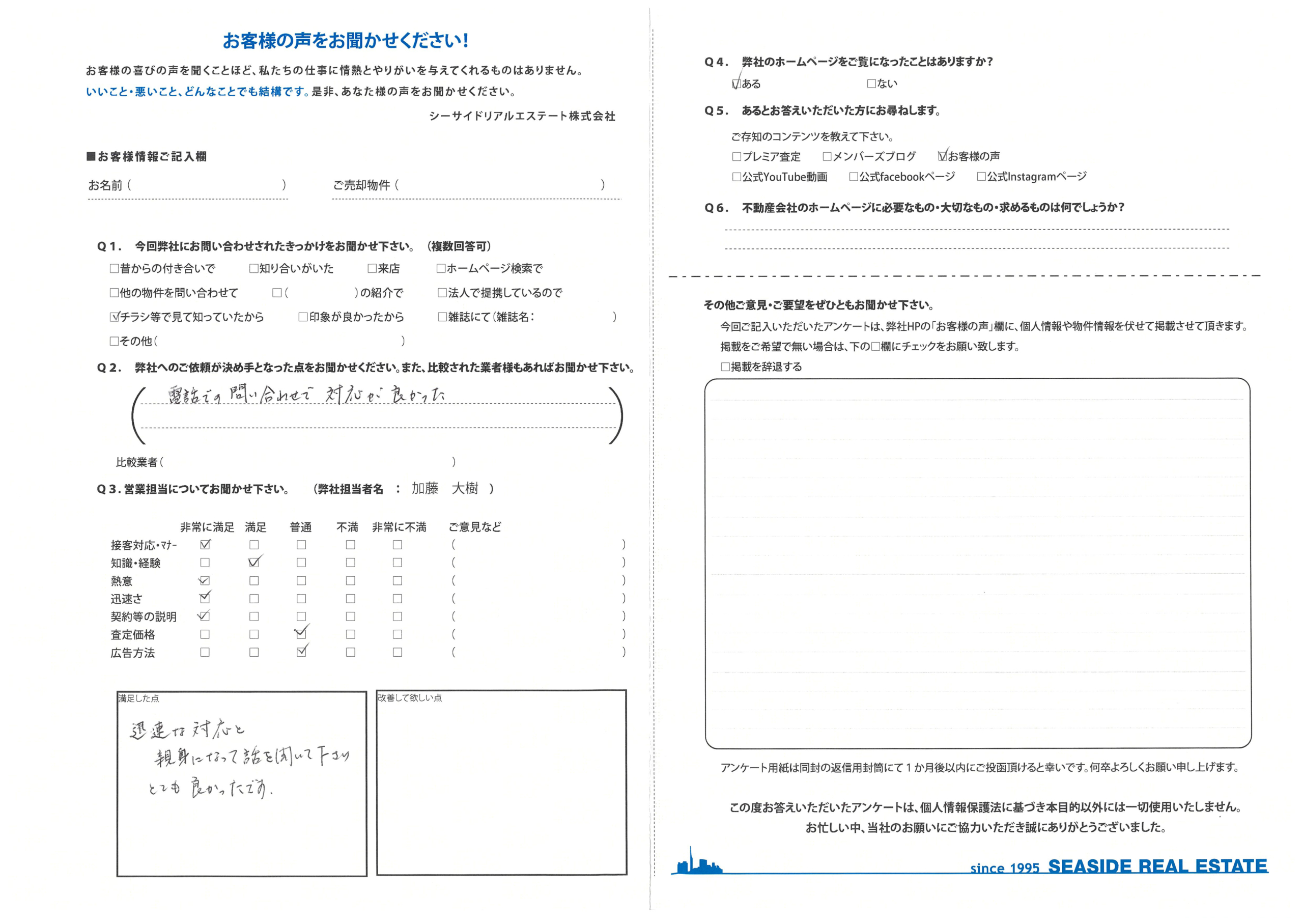 - このエリアに実績があり、担当の久保氏が当物件に詳しいことから御社に決めました。
